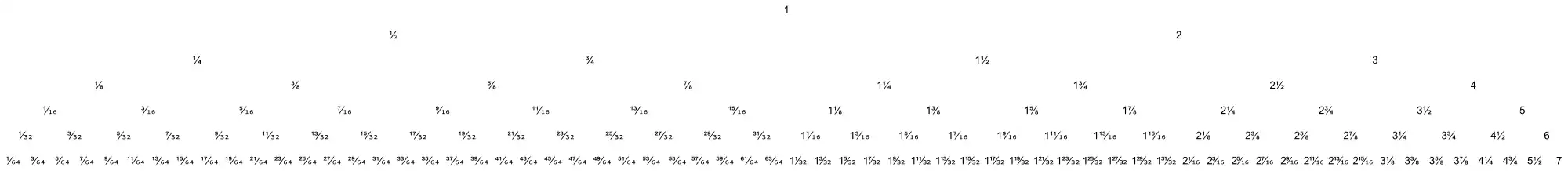 ■ Surreal number/The dyadics is a very simple introduction that might make surreal numbers seem easy to understand (if not a bit silly.) The figure to the right illustrates how rulers often subdivide the inch into dyadic fractions. The construction of surreal numbers begins with these dyadics (ranging from −∞ to +∞.) Each is assigned "birthday" and is associated with a pair of sets. Remarkably, all elements involve only the empty set, (Visit Surreal number/The dyadics for more details.)