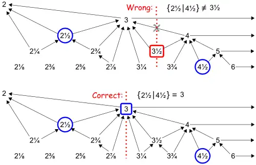 ■ Surreal number/Simplicity illustrates that illustrates a case where the surreal number is not midway bwetten and (as it is for { 0 | 1 } = 1/2, { 0 | 1/2 } = 1/4, and { 1/2 | 1 } = 3/4.)