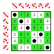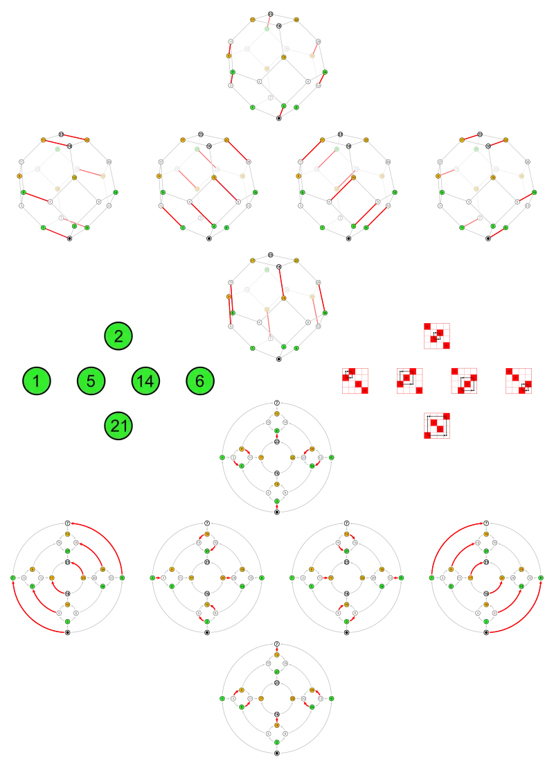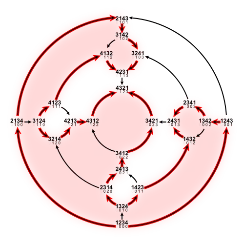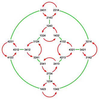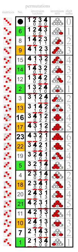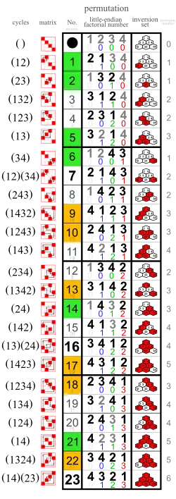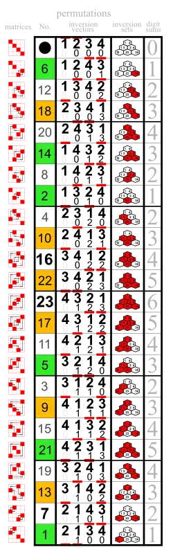 | Permutations with green or orange background are odd. Numbers in boldface type are double-transpositions. The smaller numbers below the permutations are the inversion vectors. Red marks indicate swapped elements. | |