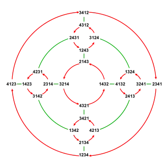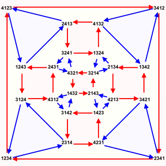 | The algorithm defines a Hamiltonian path in a Cayley graph of the symmetric group. The inverse permutations define a path in the permutohedron: | ![]() |