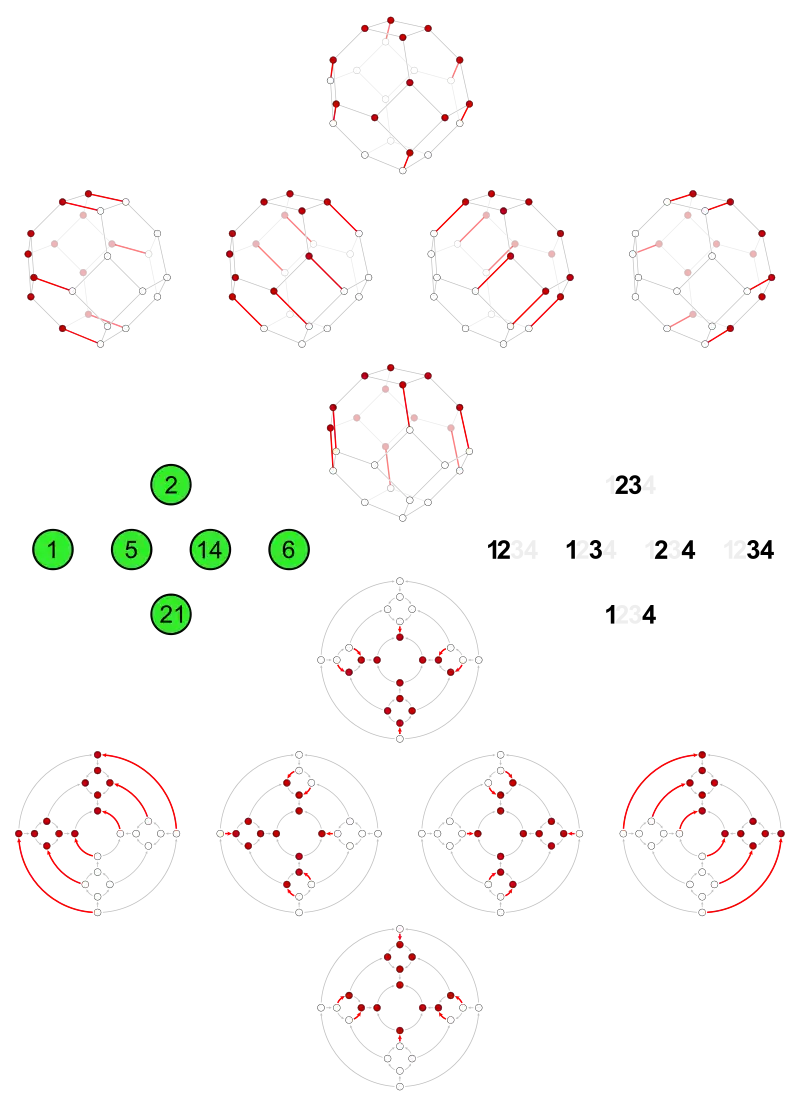 E.g. in the top permutohedron the permutations 3 and 5 are linked by a highlighted edge, representing transposition 2.