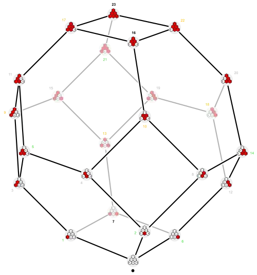 The following join table is derived from the table above. Besides the decimal enumeration, it shows also the inversion sets and factorial numbers. (The meet table is like this one, but reflected about the subdiagonal, and with all numbers replaced by their difference with 23.)