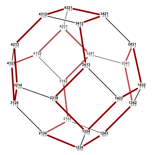 The edges of the permutohedron match transpositions, i.e. permutations exchanging only two elements.When two permutations are linked by a highlighted edge, representing one of six transpositions,