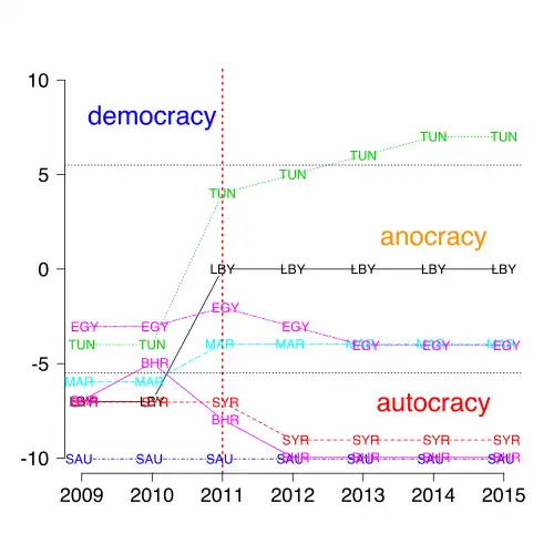 Similar though much less intense demonstrations in Morocco led to more modest changes in government there,[15] documented in the “MAR” line in the accompanying figure.