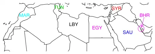 The countries featured here are (from left to right), MAR, TUN, LBY, EGY, SRY, SAU, and BHR.
