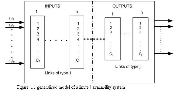 Therefore assumption 3 above implies that the system of limited availability cannot be determined by the traditional Erlang lost call calculations. Shown in figure 1.1 below is a generalized model of a limited availability system. The model is give for a system with a group of links with similar capacities this consideration applies to narrowband ISDN Pulse code modulation (PCM) links [3]. When the number of outlets N is less than the inlets M, i.e. (M>N), incoming calls will be engaged only until N=M and any further call will be blocked due to lack of resources. The challenge is to determine the probability that a call will be blocked because of a limited availability of circuits in a full availability group. This probability is called a blocking probability and can be calculated from Erlang B formula as: