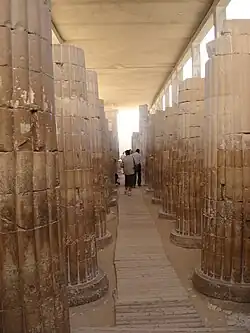 The Hypostyle Hall and Entrance Colonnade consisting of three main colonnade areas, is situated in the southeast corner of the Djoser complex and is composed of a series of rooms from the exterior perimeter wall through to the great court. These areas in sequential order from the exterior, in the west, to the great court, in the east, are the entry corridor, antechamber, east Hypostyle, west Hypostyle Hall, and enclosed portico. There are four other smaller passages, most very short in length, which are approximately one meter wide x four meters high that act as connectors.{{citation needed}