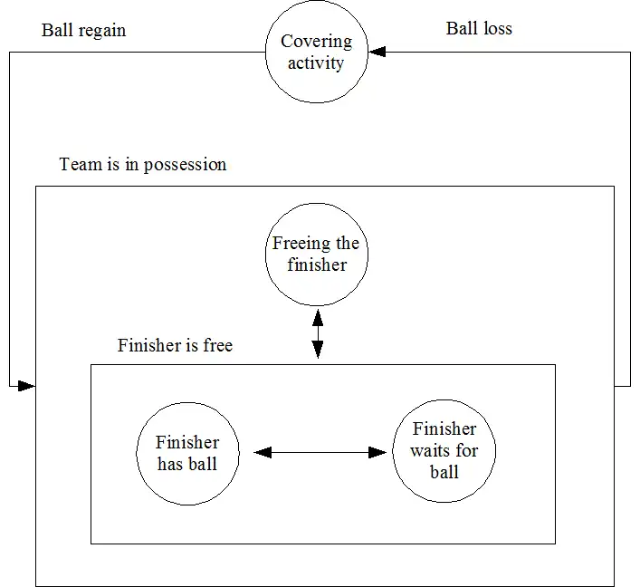 Look at the diagram below. It shows the strategic states - circles in the diagram - of a soccer team that order the game. When a team has lost ball possession, it has to cover every opponent. When a team controls the ball, it tries to get one of its players into a free position to score. When this is achieved, the team tries to pass him the ball. During the game, the transitions – arrows in the diagram – from one state to another are often quick and dynamic. This is the Common Soccer Strategy.