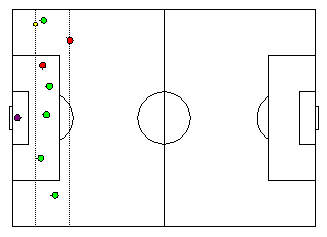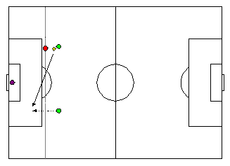 How to counter this coverage? Look at the following diagram. A wing attacker has succeeded in almost reaching the goal line with the ball. Since there is no offside behind the ball, some team-mate in the middle may receive a backward pass and score. In order to play this way through the wings and centre, five forwards turned out to be optimal.