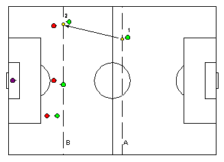 The other way round: Sometimes it is clever to pass the ball backward. In our example, a pass from player 2 to player 1 creates a numerical superiority by shifting the active zone from B to A.
