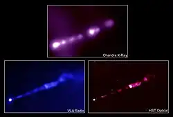 The images show a relativistic jet emanating from the active galactic nucleus of M87 using X-ray, radio, and optical astronomy. Credit: NASA/CXC/VLA/HST.