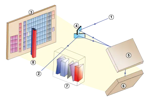 The design of the Gaia focal plane and instruments. Due to the spacecraft's rotation, images cross the focal place array right-to-left at 60 arc seconds per second.[40]