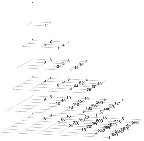 | 6 | 1 · 1 1 | 6 · 1 −6 | 15 · 2 30 | 20 · 6 −120 | 15 · 26 390 | 6 · 158 −948 | 1 · 1330 1330 | 677 | |