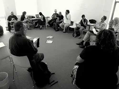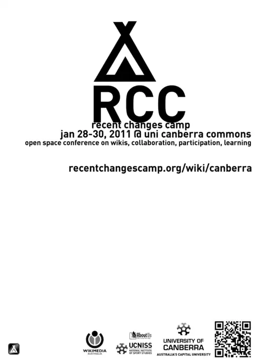 ![]() ![]() RecentChangesCamp2011 was an OpenSpace unconference focused on wikis and online collaborative practices. RCC2011 was organised by University of Canberra staff in National Institute of Sport Studies (UCNISS), following the success of the RCC2010 event, and RecentChangesCamps held in other parts of the world. The main characteristics of the event were that it was free to attend, open to anyone, with a program determined on the day by the participants. The aim of the event was to draw together people interested in worldwide iterative knowledge involvement or wikis, to discuss and share knowledge, and eat and socialise in a friendly face to face setting.