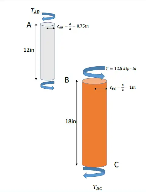 We need to split the solid shaft AC into two free body diagrams, shaft AB and shaft BC Given