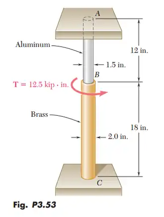 The solid cylinders AB and BC are bonded together at B and are attached to fixed supports at A and C. The modulus of rigidity is for aluminum and for brass.