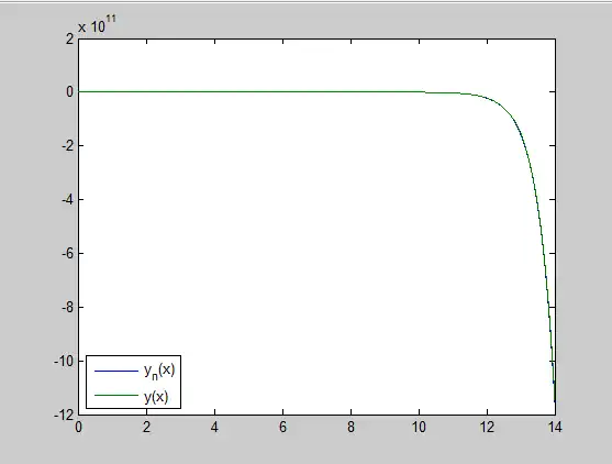 Plotting the aboved vector of y-values,along with the results from earlier yields the following graph: