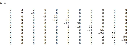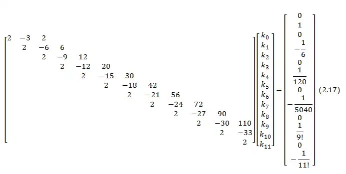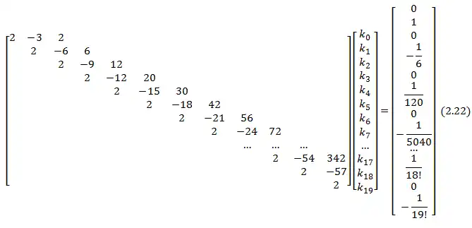 {\displaystyle \displaystyle {\begin{bmatrix}2&-3&2&0&0&0&0\\0&2&-6&6&0&0&0\\0&0&2&-9&12&0&0\\0&0&0&2&-12&20&0\\0&0&0&0&2&-15&30\\0&0&0&0&0&2&-18\\0&0&0&0&0&0&2\\\end{bmatrix}}\cdot {\begin{pmatrix}{A}_{0}\\{A}_{1}\\{A}_{2}\\{A}_{3}\\{A}_{4}\\{A}_{5}\\{A}_{6}\end{pmatrix}}={\begin{Bmatrix}0\\1\\-1/2\\1/3\\-1/4\\1/5\\-1/6\end{Bmatrix}}}