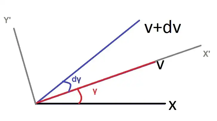 The Above figure represents the original axes and the new axes. It also shows the vector representations of the velocities at time=t and time=t+dt.