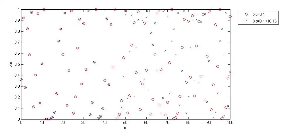 The Following Plot explores the big effect of a small change in the initial conditions. One can note the changes as 'n' becomes larger than 50. The graph was produced for the following Conditions: