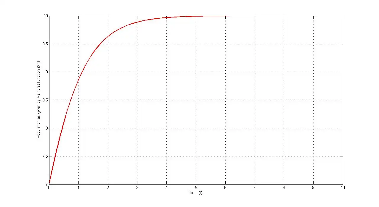 THE PLOT SHOWING THE POPULATION CHANGE W.R.T TIME, HERE VERHULST MODEL IS USED TO COMPUTE THE POPULATION WHERE XO=INITIAL POPULATION=7