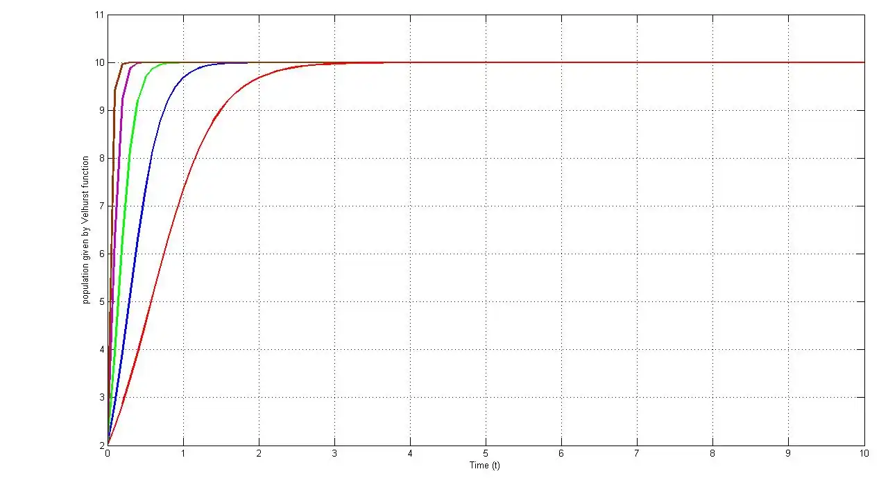 THE PLOT SHOWING THE POPULATION CHANGE W.R.T TIME, HERE VERHULST MODEL IS USED TO COMPUTE THE POPULATION WHERE XO=INITIAL POPULATION=2