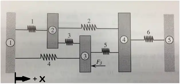 The forces in the springs are found by the following equations. Negative forces display compressions and positive tensions.