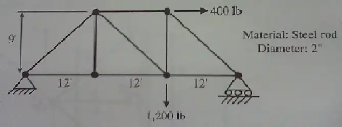 Determine the member force and axial stress in each member of the truss shown in the figure using one of the FE analysis programs in the Appendix. Assume that Young’s modulus is 104 psi and all cross-sections are circular with a diameter of 2 in. Compare the results with the exact solutions that are obtained from the free-body diagram.[2]