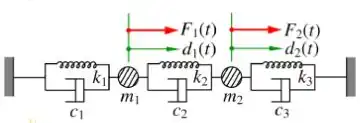 1. Draw the FBDs of all components in the spring-mass-damper system in Figure 1 below, with the known displacement degree of freedoms being at the left and right supports. ( and )