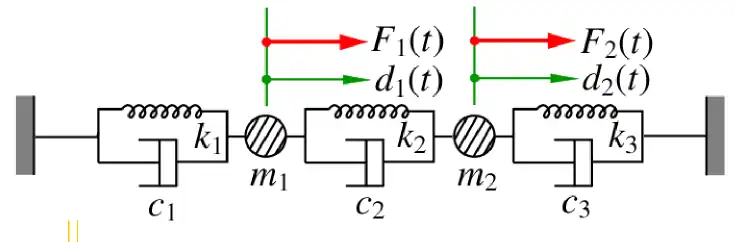 From equations 2.5 and 2.6, the motion of the masses will influence each other. Where, the motion of mass 1 will influence mass 2 and vice versa. Equations 2.5 and 2.6 can be rewritten in matrix form. Therefore, we can now write them as: