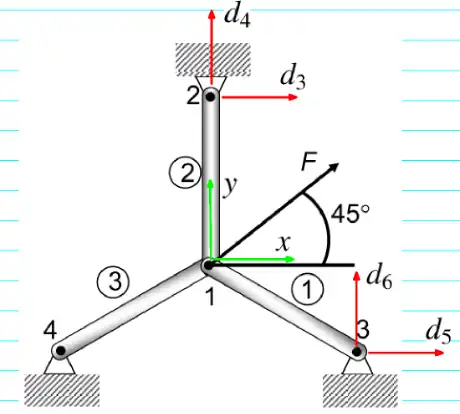 For the 3-bar truss example in K.2008.2 on pg. 43, solve this problem, but with non-zero prescribed disp dofs, using your own FE matlab code(not CALFEM). Using the same "connectivity array" given in the same problem statement, provide all of the results, including all of the unknown global disp dofs, force components(reactions), and member forces. Plot the deformed shape superposed on the undeformed shape. Verify the results with CALFEM.