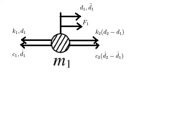 As for the mass matrix, we see that in Equation 3.2.5 there is only mass 1 present and in equation 3.2.6 only mass 2 is pressent, therefore we have: