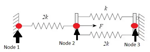 Because node one and three are attached to the wall, their displacements are zero:Now we solve the follwing equation: