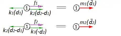 Analyzing the forces on mass one, we obtain: