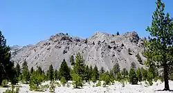 Recent work has identified products from three separate mildly explosive basaltic eruptions ("Bu" 1, 2, and 3) that took place over a time span of about 150 to 200 years (about 1.9 to 1.7 ka). Several basalt to dacite lava flows erupted in the same time span, which transformed the Pine Creek-age cluster of domes into a classic cone shaped composite volcano. Three basaltic lava flows poured down the flanks of the volcano reaching up to 13 km (8 mi) from their source - the preCave (1.8 ka) and Cave basalt (1.895 ka) on the south flank, and the Castle Creek basalt (1.74 ka) on the north flank. The summit elevation at the end of Castle Creek time was about 2,450 m (8,000 ft)."[12]