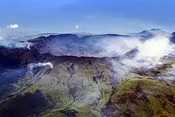 {{free media}}The image at right is a "detailed astronaut photograph [that] depicts the summit caldera of the volcano. The huge caldera—6 kilometers (3.7 miles) in diameter and 1,100 meters (3,609 feet) deep—formed when Tambora’s estimated 4,000-meter- (13,123-foot) high peak was removed, and the magma chamber below emptied during the April 10 eruption. Today the crater floor is occupied by an ephemeral freshwater lake, recent sedimentary deposits, and minor lava flows and domes from the nineteenth and twentieth centuries. Layered tephra deposits are visible along the northwestern crater rim. Active fumaroles, or steam vents, still exist in the caldera."[1]