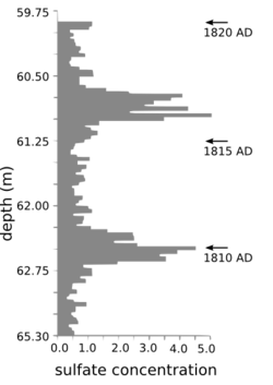 The image on the left exhibits sulfate concentration in an ice core from Central Greenland, dated by counting oxygen isotope seasonal variations. There is an unknown eruption around the 1810s.[6]