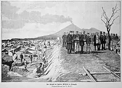 This photograph shows a visit of Kaiser Wilhelm I while Vesuvius is undergoing a mild eruption in the background.