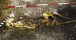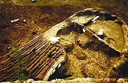The image on the right shows the mold of one of a group of huts found partially buried, its interior, including pottery, perfectly preserved, dated to 3800 b2k.