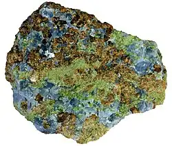 The skarn in the image on the right is from the Monzoni Ridge. It is "composed of calcite (blue), pyroxene augite (green), and garnet grossular (orange)."[13]