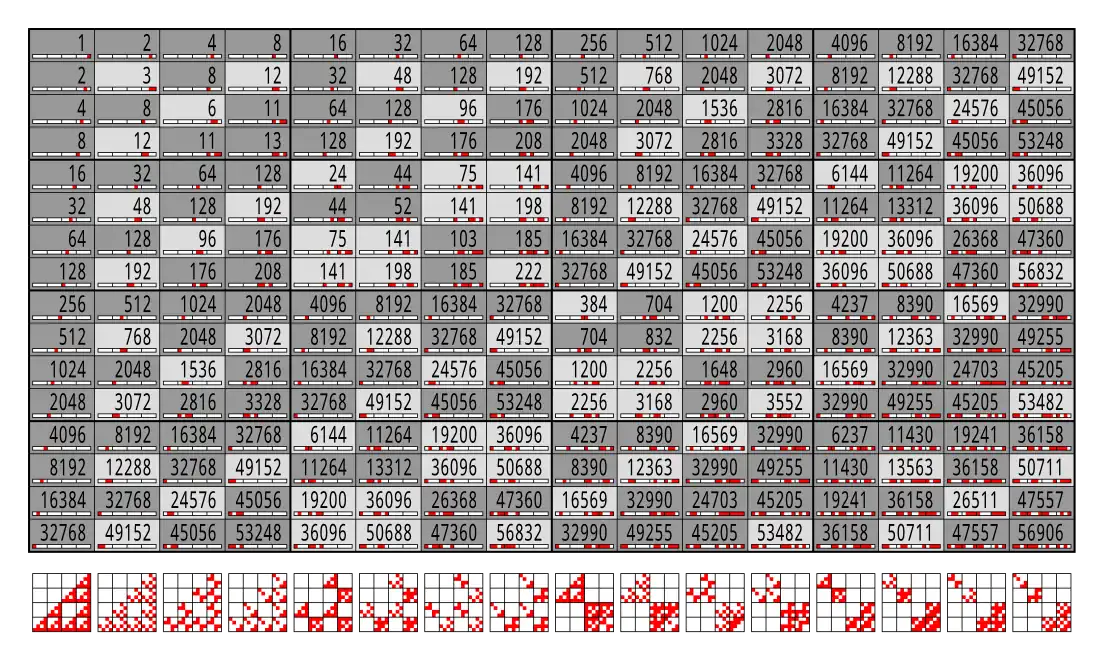 Further it can be seen that the nim-products of 2-powers are related to the compression vectors on the right.