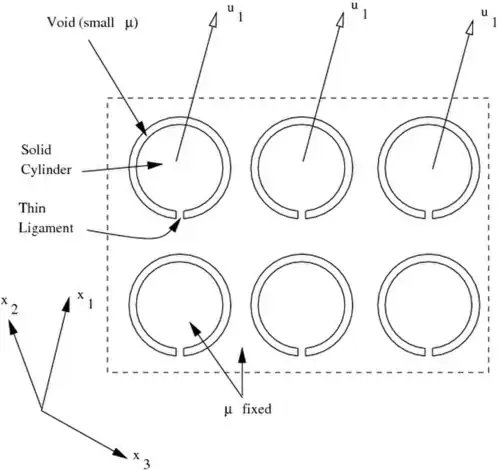 Figure 2. A periodic geometry containing split hollow cylinders of soft material in a matrix of stiff material. The direction is parallel to the axis of each cylinder.