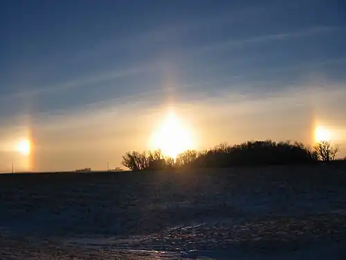 One can also often see sundogs at the sides of icehalos where the intensity of the light is high. An image of sundogs adjacent to a halo can be seen below.