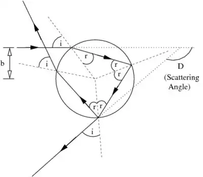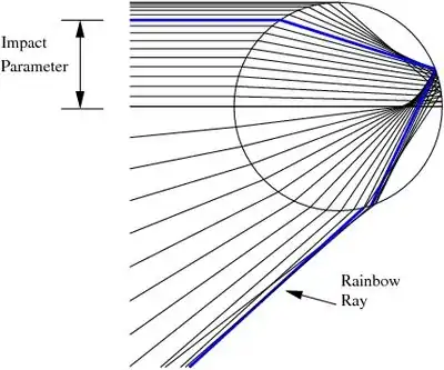 The scattering angle is defined as the angle between the incident and the transmitted rays. For the primary rainbow, the scattering angle is the angle between the incident rays and the rays transmitted after one internal reflection. For the secondary rainbow, the scattering angle is the angle after two internal reflections. A plot of the scattering angle as a function of the impact parameter is shown in Figure 4. The scattering angle reaches a peak at a value of 180°-42° for the primary rainbow and at an angle of 180°-51° for the secondary rainbow.