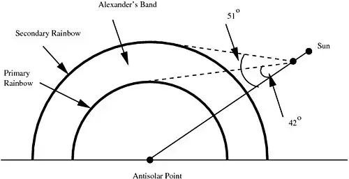 - The sky is darker inside the Alexander's band that separates the primary and the second rainbows.
