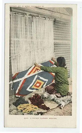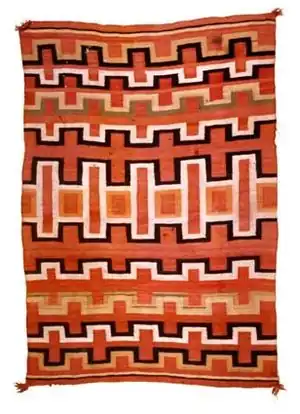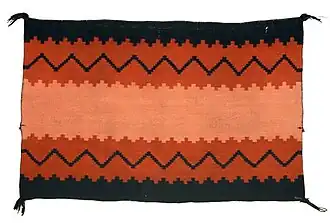 The blanket on the left is a Navajo woman's fancy manta, wool, ca. 1850-1865, worn as a blanket or a wrap-around dress.[2]