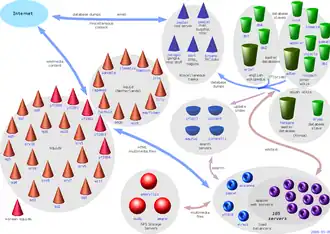 http://meta.wikimedia.org/wiki/Server_layout_diagrams - these diagrams give a bit of an overview of just what we're dealing with here. This thing is big and it changes all the time.