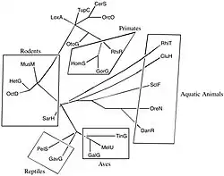 A phylogenetic tree was constructed for the orthologs that were analyzed in comparison to Homo sapiens. With the species of latest divergence being Rhincodon types, or the whale shark.[38][39]