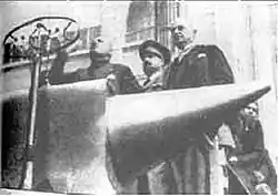 In the midst of this uncertainty, the Fascist Party went from strength to strength. Having founded a Confederation of the Corporations, as a sort of Fascist labour union in 1922 uniting workers and business interests, it used its unemployed members as strike-breakers and squad members. Throughout the country it acted to break strikes and repress all left wing parties.[21] Mussolini's patriotism and nationalism had already attracted the attention of the country's landowners and industrialists. However, to clinch their support and, importantly, that of the Army, Mussolini abandoned his original republicanism and accepted the monarchy.[22] Mussolini then ordered his Blackshirts to “march on Rome” to pressure the government whilst he negotiated with it. The government instead decided to declare a state of siege and called out the army. In the opinion of many historians, this would have been sufficient to put an end to the Fascist movement's dreams.[23] Instead, on the eve of the 29th of October 1922, the king of Italy, Vittorio Emanuele III, vetoed the state of siege. This placed Mussolini in a position to demand the prime ministership, which he duly received two days later. The Italian ruling elites thought support for Fascism was the best way to preserve their positions of privilege.[24] Once in power Fascism would turn out to be the Trojan horse that would ultimately subvert and destroy the precariously poised Italian state.