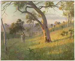 Fuller's paintings from this period included A Golden Hour, described by the National Gallery of Australia as "a masterpiece ... giving us a gentle insight into the people, places and times that make up our history".[1] The painting, an oil on canvas 109 cm (43 in) high and 135 cm (53 in) wide, portrays a woman and a man standing together in a rural setting in late afternoon, surrounded by grass, scattered gum trees, and Xanthorrhoea. When the painting was put up for sale in 2012, the auction house catalogue stated that it had been owned by William Ride, former director of the Western Australian Museum. It reported:
